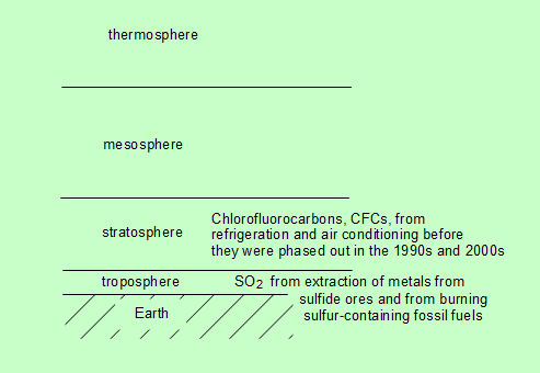 layers would probably be preferable but not essential. CFCs are the major ones for the stratosphere. Although use of these compounds has been phased out, there are still significant concentrations of them in the stratosphere (and will be for another 20 to 30 years). You could use oxides of nitrogen from high flying aircraft as an alternative, but only if you can't remember the CFCs. Alternative pollutants for the troposphere are CO and hydrocarbons from the incomplete combustion of fossil fuels; oxides of nitrogen (NO and NO2) from power stations and motor cars (burning fossil fuels); and ozone formed from hydrocarbons and oxides of nitrogen in photochemical smog. But note that you cannot call ozone a pollutant in the stratosphere it has no detrimental effects there, only good ones. (p. 236-40, 250-8) |